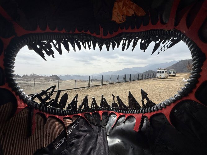 The primary materials are waste items from the factory—helmets, boots, scrap iron etc along with trash collected by the artist, his assistants and the company employees, on the Izu Peninsula. Trash gathered by the company's employees from the Sagami River, which holds deep ties to the company, is also incorporated.